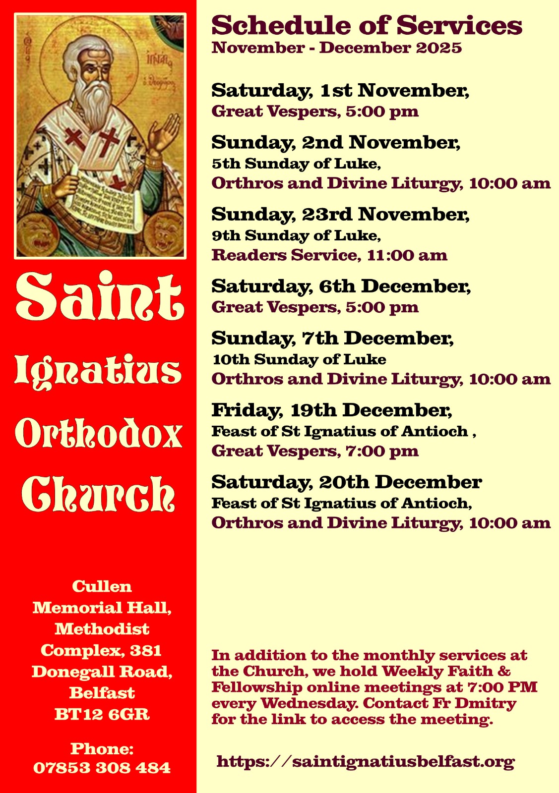 Below on this page, you will find a list of upcoming services, a poster with the schedule for the next few months, and the calendar of services and events, which you can also subscribe to so you never miss anything.